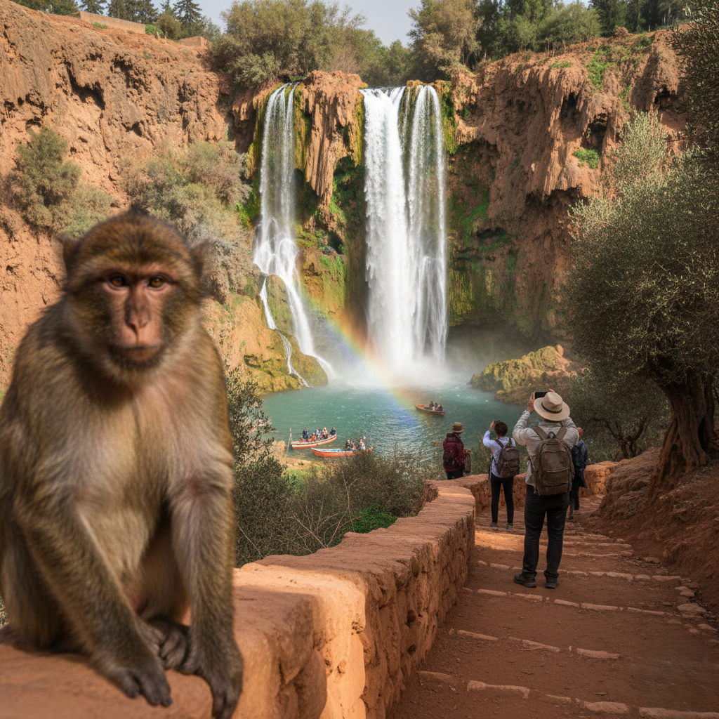 The hike down to the base of the falls is an adventure in itself. The trail winds between the cliffs, offering a new 360° panorama of the surrounding mountains at every turn. Halfway down, visitors often stop to observe the Barbary macaques . These playful monkeys, accustomed to human presence, live here in complete freedom. Watching them leap from branch to branch or tend to their young under the watchful eyes of tourists is a rare and precious glimpse into wildlife.