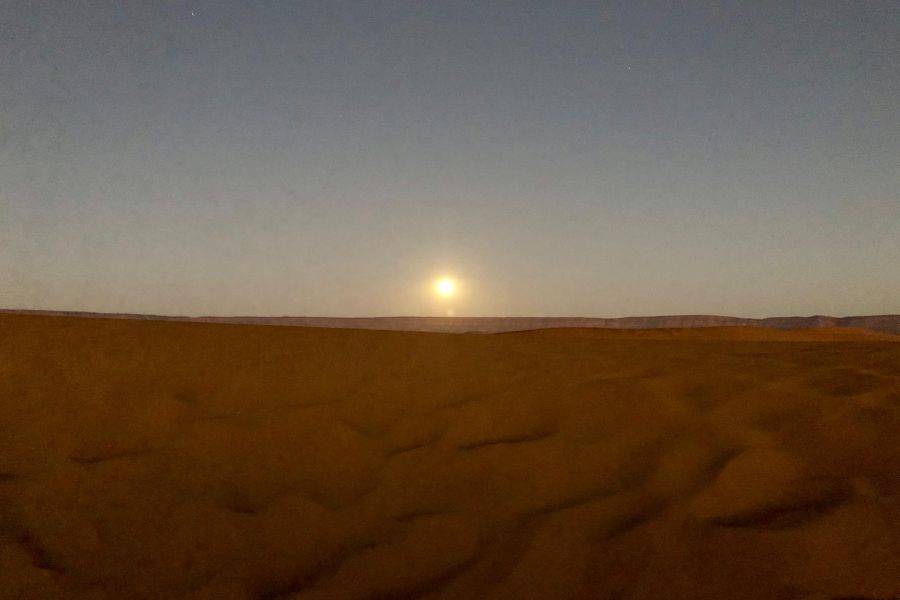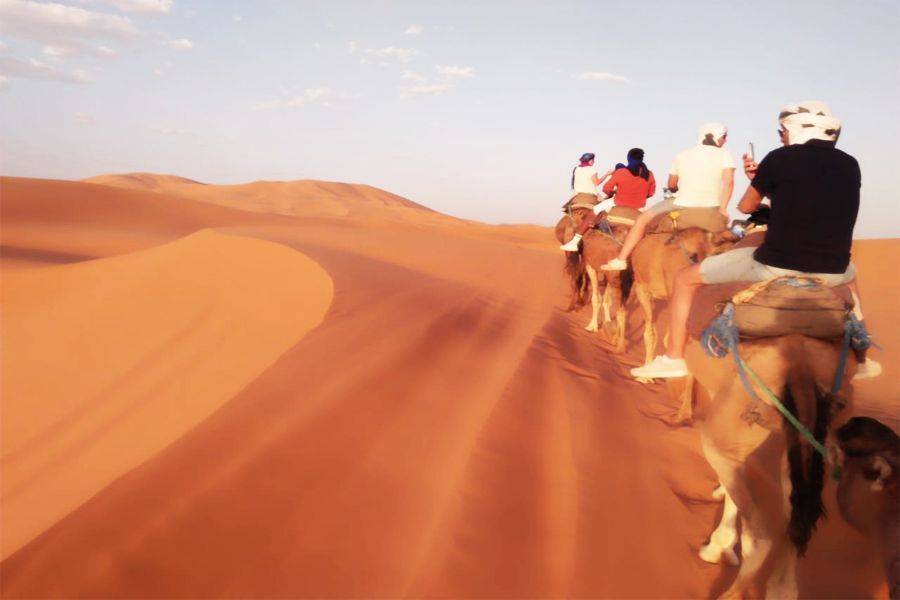 Aangekomen in Merzouga, zullen we kamelen ruilen om ons onder te dompelen in de woestijn en op weg te gaan naar het bedoeïenenkamp waar we de nacht zullen doorbrengen en genieten van een traditioneel Marokkaans diner.